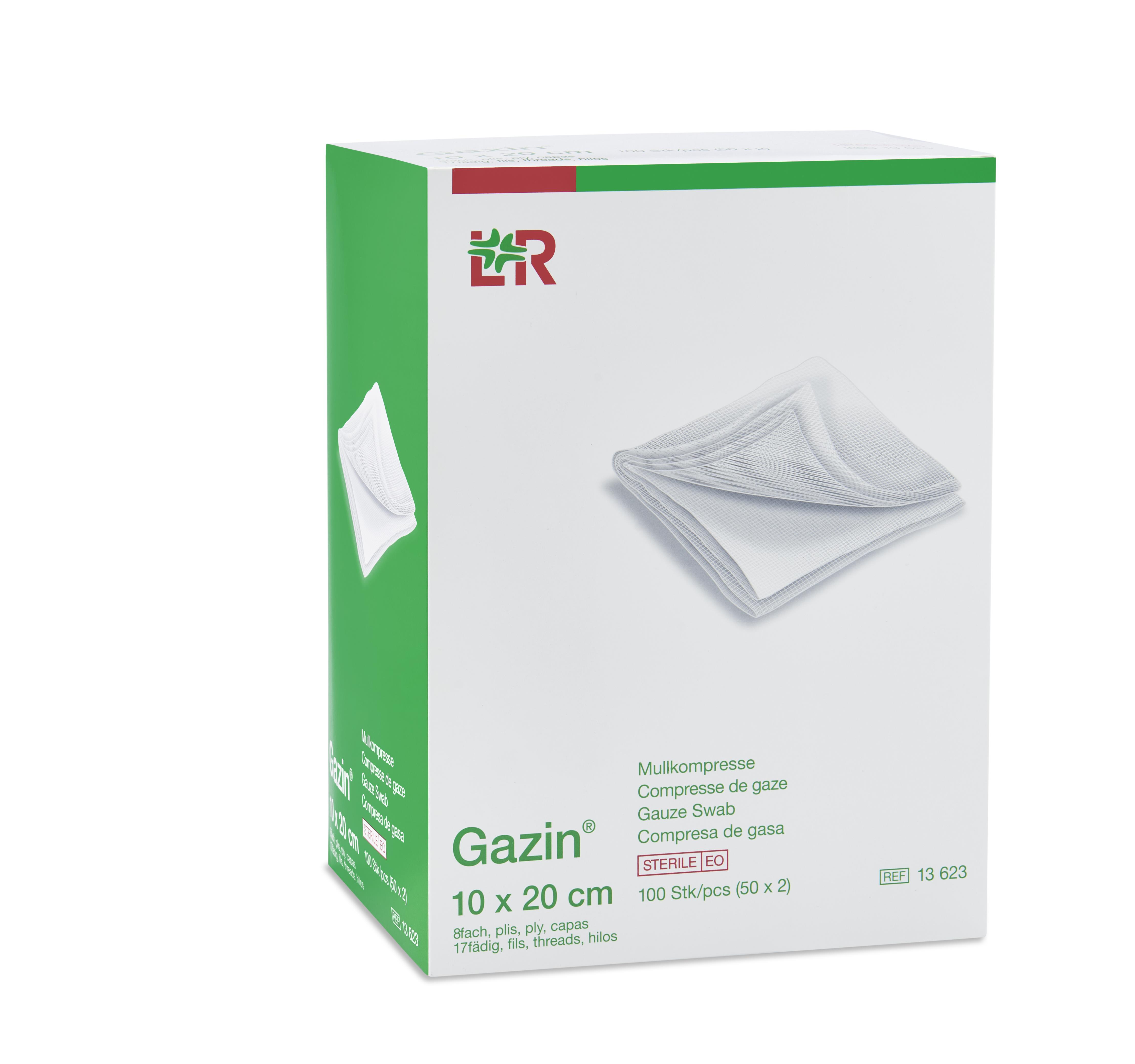 Gebrauchsfertige Kompressen aus Verbandmull, DIN EN 14079, 17-fädig, 8-fach gelegt, mit eingeschlagenen Schnittkanten, paarweise eingesiegelt, Kartoninhalt: 50 x 2 = 100 Kompressen für die Sprechstunde