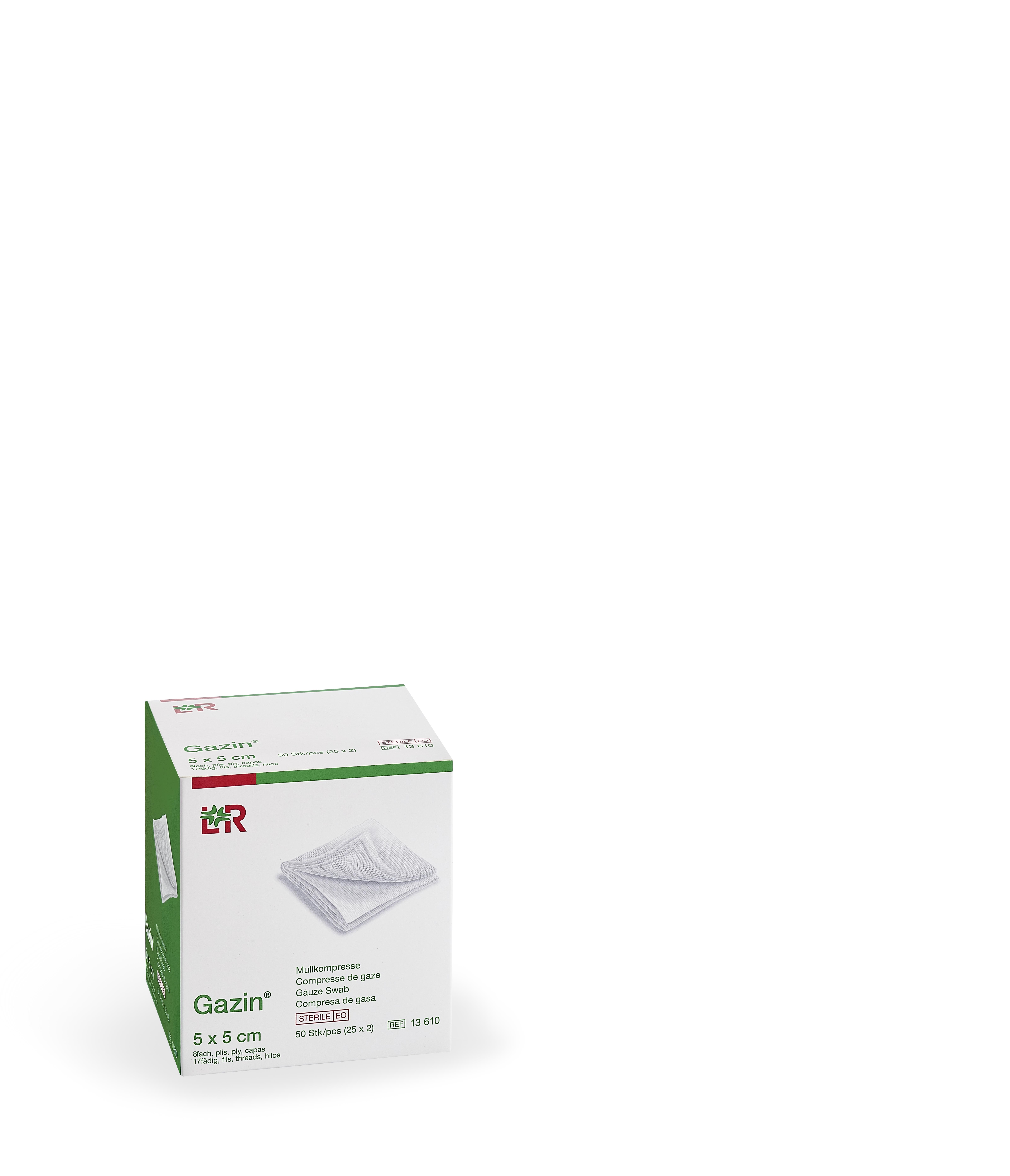 Gebrauchsfertige Kompressen aus Verbandmull, DIN EN 14079, 17-fädig, 8-fach gelegt, mit eingeschlagenen Schnittkanten, paarweise eingesiegelt, Kartoninhalt: 25 x 2 = 50 Kompressen für die Sprechstunde