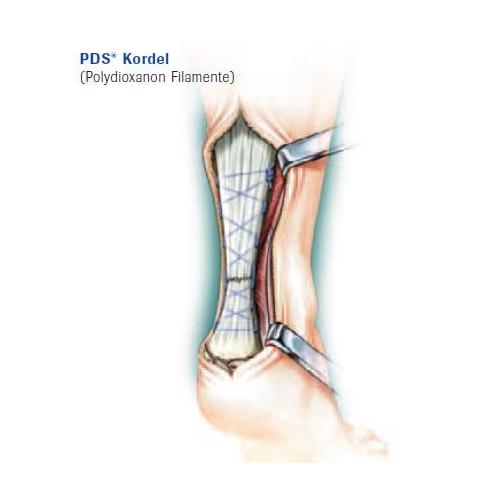 Die PDS® Kordeln bestehen aus Polydioxanon-Filamenten, die rund geflochten und in verschiedenen Durchmessern von 0,7 mm bis 2,0 mm erhältlich sind. Außerdem sind einige Kordeln mit einem transossären Durchzieher versehen. Die Durchmesserstärke wird dem Einsatzgebiet angepasst. Die Kordel wird