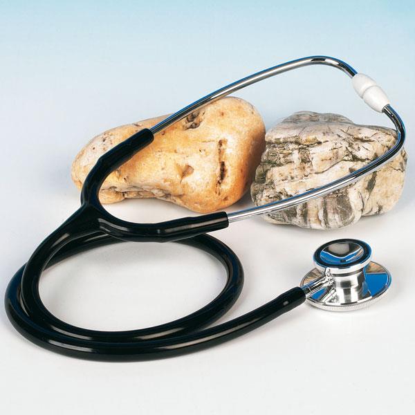 Kombinationsstethoskop für alle Bereiche, Pädiater, Kardiologen usw., mit außenliegender Ohrbügelfeder, drehbarem Doppelkopf und einem Zubehöretui mit 3 Trichtern, 2 Membranen und 2 Paar schwarzen (weich/hart) Ohroliven, 100 % latexfrei und nickelfrei, große Membrane: 40 mm Ø, kleine Membrane: 26 mm Ø, Gesamtlänge: 75 cm, Gewicht: ca. 226 g