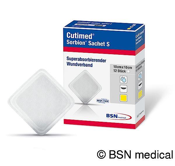 Cutimed® Sorbion® Sachet S ist ein superabsorbierender Wundverband zur Versorgung von mäßig bis stark exsudierenden Wunden.