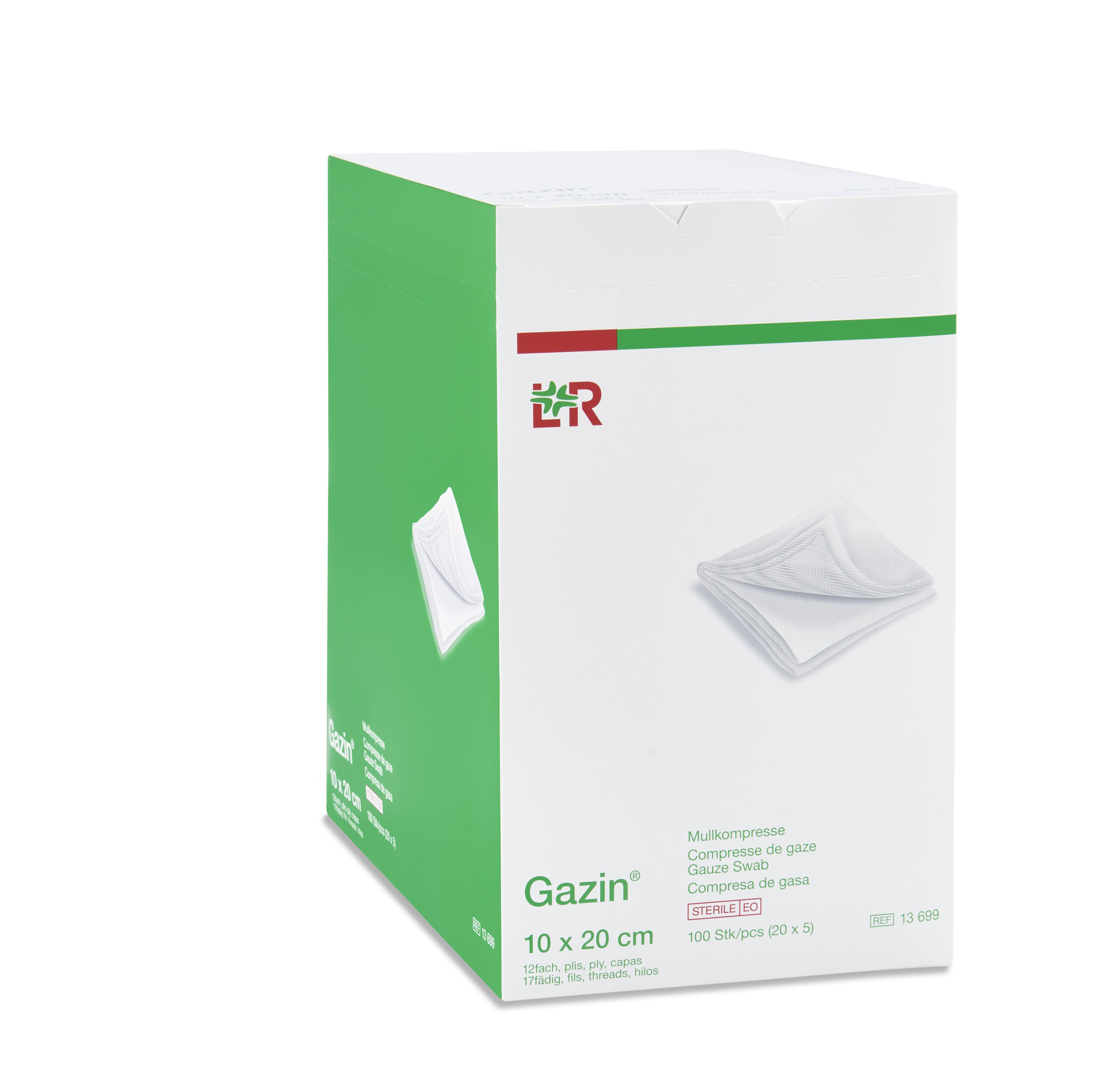 Steril-Kompressen gebrauchsfertige Kompressen aus Verbandmull, DIN EN 14079, 17-fädig, 12-fach gelegt, mit eingeschlagenen Schnittkanten, paarweise bzw. à 5 St. eingesiegelt