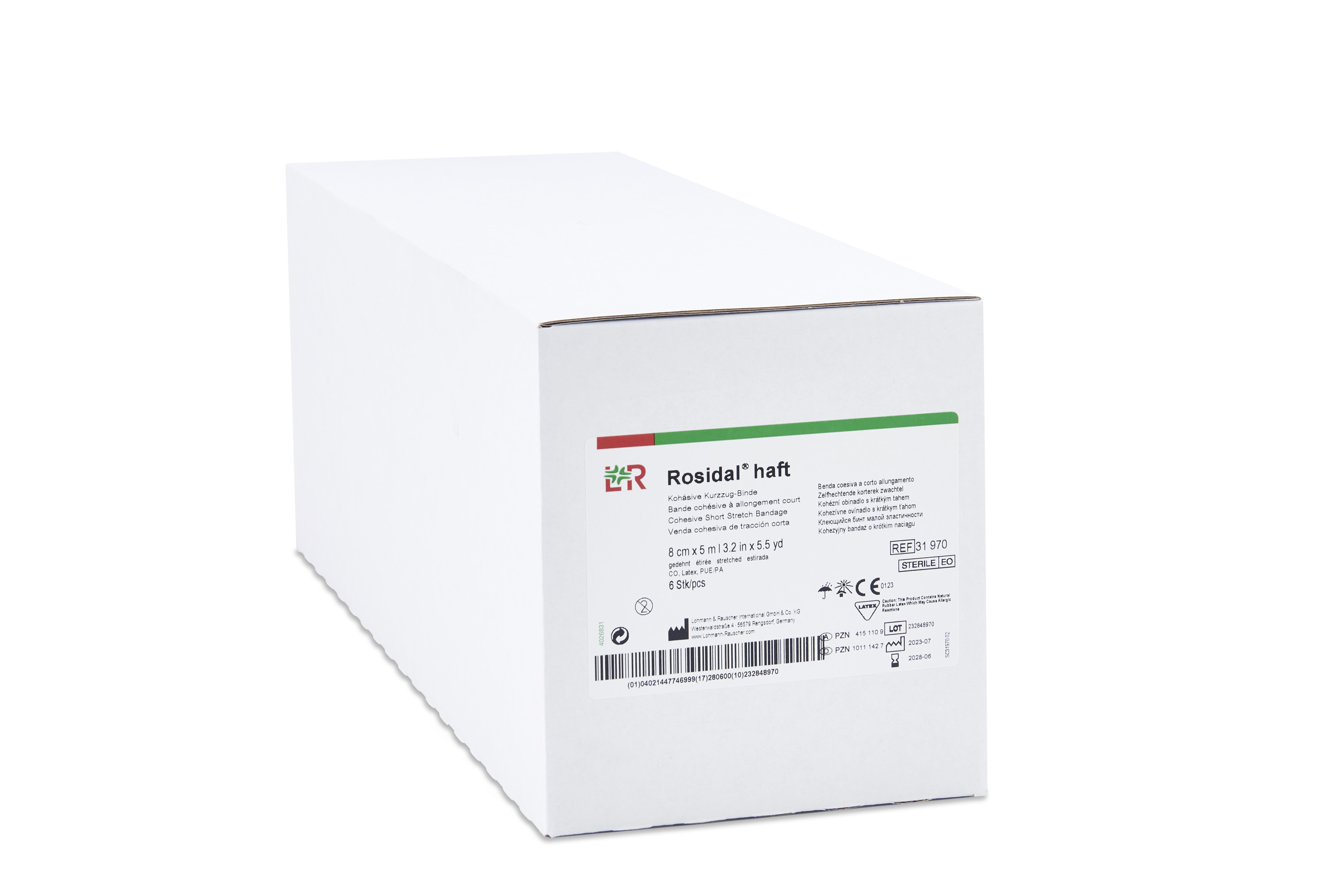 Hautfarbene, kohäsive Kurzzugbinde, feste Webkanten, kurzzügig, dichtes Gewebe, 100 % Baumwolle, zur Kompression der Extremitäten bei phlebologischen und lymphatischen Erkrankungen, zur Behandlung von Ödemen, nach Sklerosierung und venenchirurgischen Eingriffen und zum Stützen und Entlasten des Kapselbandapparates 5 m gedehnt, einzeln in Faltschachtel