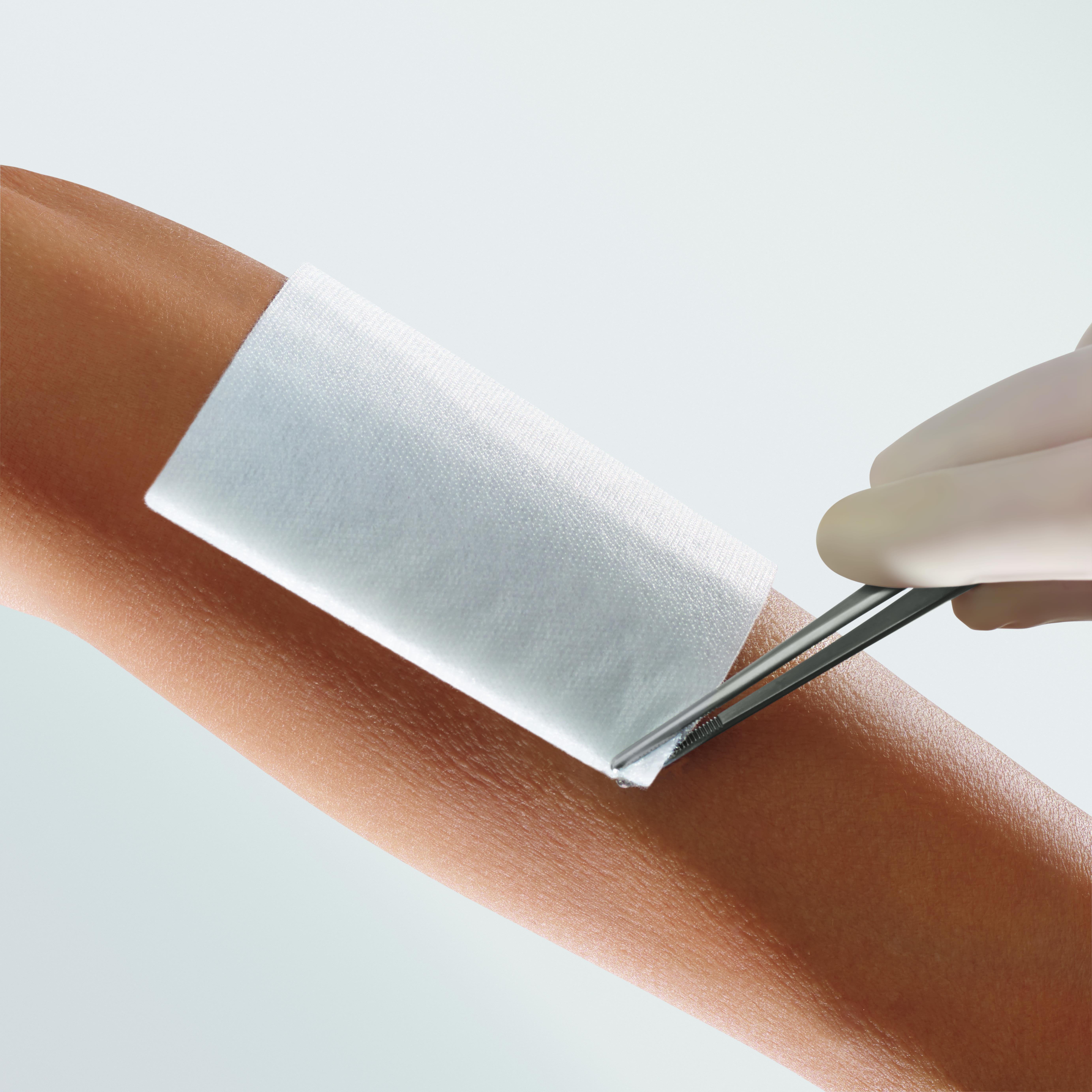 hochsaugfähiger Viskose-Polyester-Kern beidseitig perforierte Polyethylen-Folie zur schnellen Aufnahme von Wundexsudat verklebungsarm: ermöglicht schmerzarme und atraumatische Verbandwechsel beidseitig anwendbar durch Folienauftrag auf Unter- und Oberseite identische Geometrie der Seiten gibt Sicherheit beim Einlegen