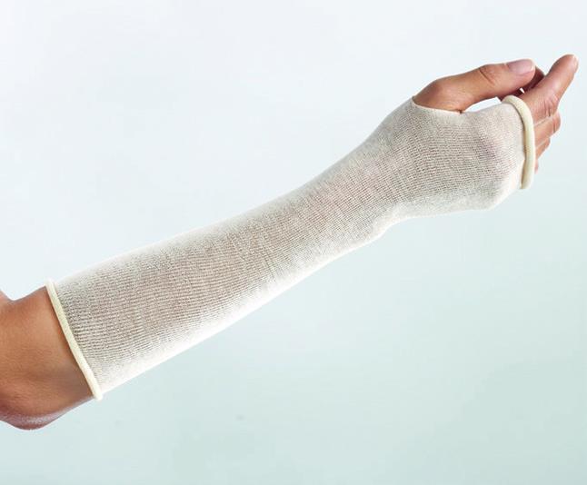 Der Delta Terry-NetTM S ist ein synthetischer Frotteeschlauch, der hautfreundlich, feuchtigkeitsabweisend und elastisch ist. Er verfügt über eine faltenfreie Passform und ist einfach und schnell in der Handhabung. Er ist auch mit Daumeneinschluss erhältlich und bietet einen hohen Tragekomfort für den Patienten. Der Delta Terry-NetTM S synthetischer Frotteeschlauch besteht aus 95 % Polyester, 3 % Nylon und 2 % Spandex. Latexfrei Anwendungsgebiete Unterpolsterung von synthetischen Starr- und Stützverbänden jeder Art und Größe Abpolstern von Schienen Unterzug für FCT